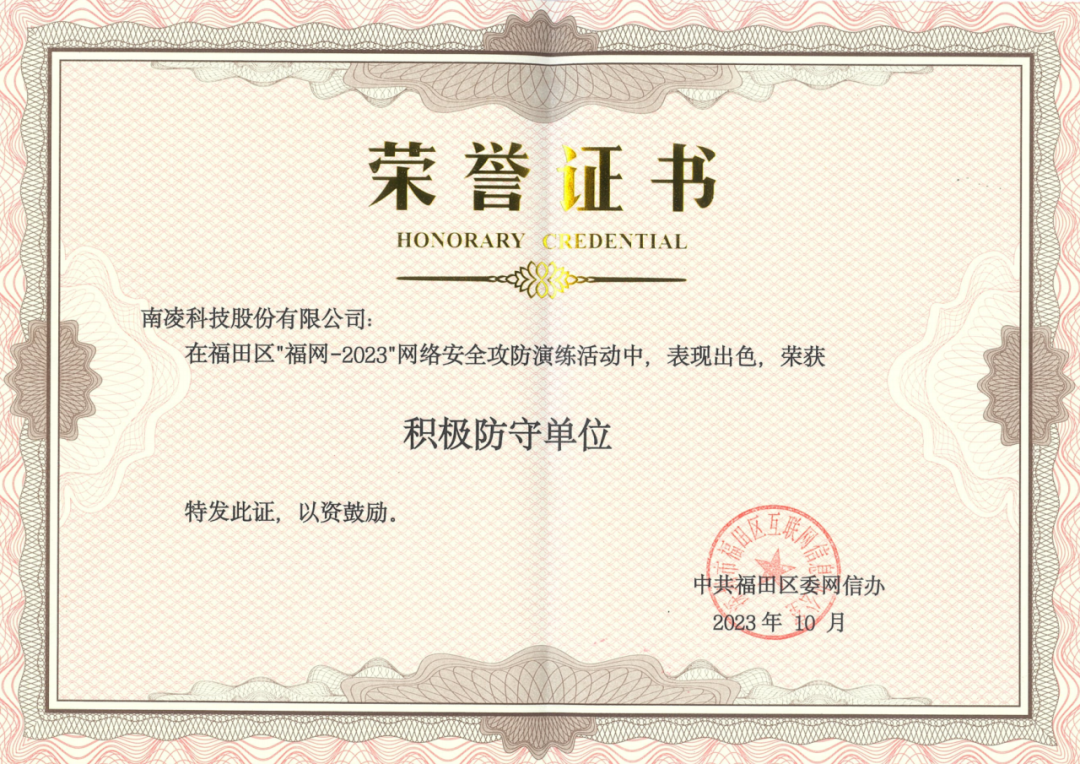 10月16日,中共福田區(qū)委網(wǎng)信辦聯(lián)合福田公安分局、福田區(qū)政務服務數(shù)據(jù)管理局組織召開“福網(wǎng)-2023”福田區(qū)網(wǎng)絡安全攻防演練總結(jié)會,通報“福網(wǎng)-2023”攻防演練相關(guān)情況,并向攻擊方、防守方單位代表頒發(fā)證書,南凌科技股份有限公司作為防守方,榮獲“積極防守單位”稱號!