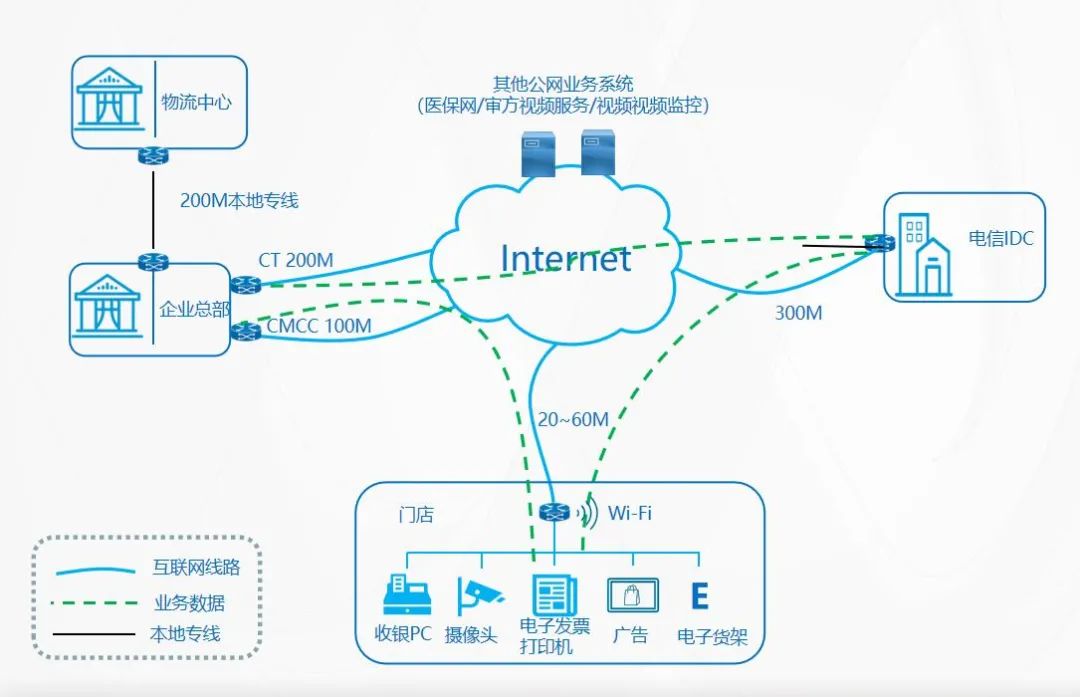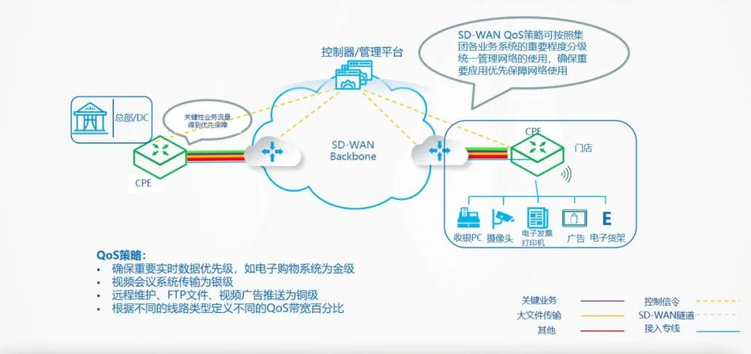 此外,該方案還可根據門店實際情況,提供SD-WAN當日開通、次日開通和按需開通服務,網絡管理服務可監控各業務流量使用情況與帶寬使用率,SD-WAN應用識別與QoS,限制業務無關流量,保證關鍵業務流量。自研SD-WAN 2.0建立的業務基礎網絡平臺,可實現平臺的可視化和智能化,內部網絡和設備等問題都能被快速發現和解決,從而降低網絡故障對業務影響,業務數據的精細化管理能有效利用現有資源,高效支持業務發展及網絡擴展。