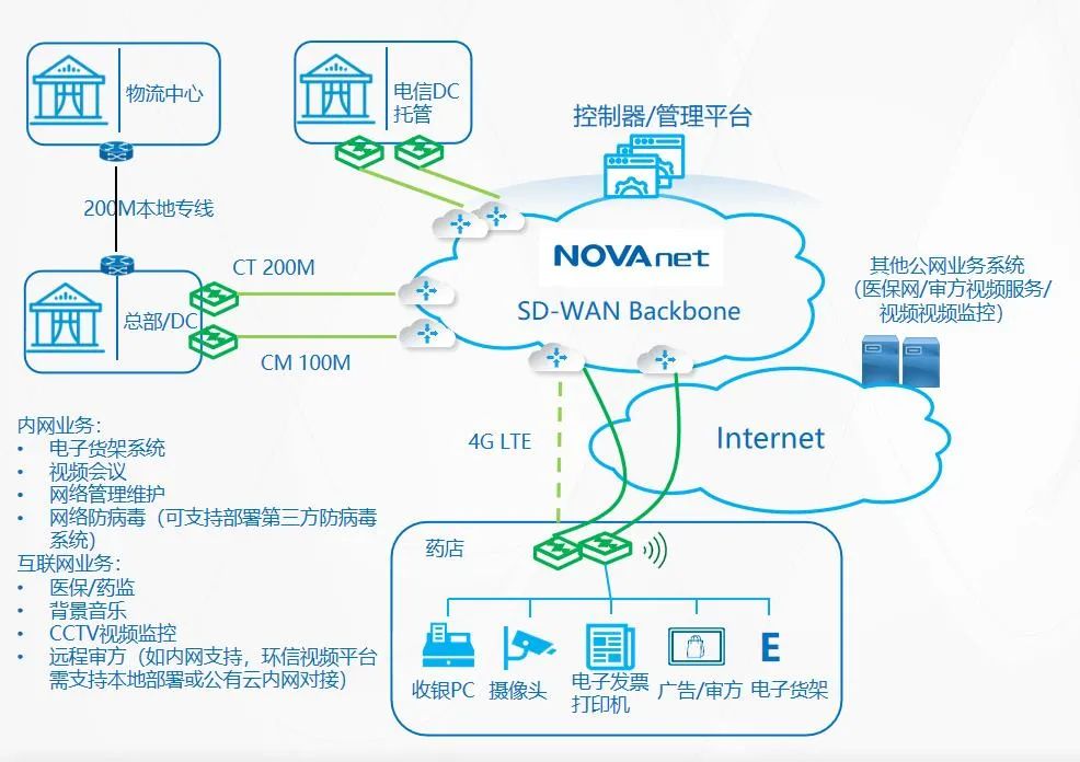 面對藥品零售行業的數字化轉型難題,南凌科技以自身的自主研發實力和25年專網通信服務經驗,探索出藥品零售行業在數字化變革下的新模式,并通過充分發揮自研SD-WAN 2.0為企業賦能,開辟出驅動藥品零售“網絡數智化”的新路徑,在此實踐過程中,逐漸形成兩大關鍵能力——網絡中心控制和應用優化設計。