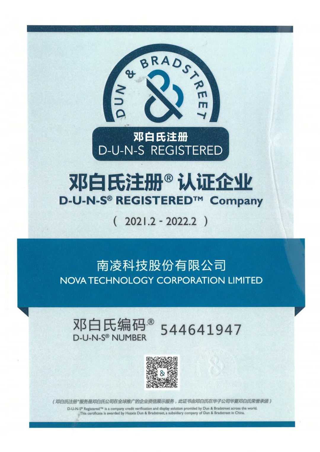 憑借良好的企業運營理念及商業信用,南凌科技于近期再次順利通過國際著名商業信息服務機構鄧白氏的權威認證,獲得了鄧白氏編碼(D-U-N-S? Number,全稱Data Universal Numbering System)這一全球統一標志,更進一步與全球企業接軌,提升了公司品牌形象。