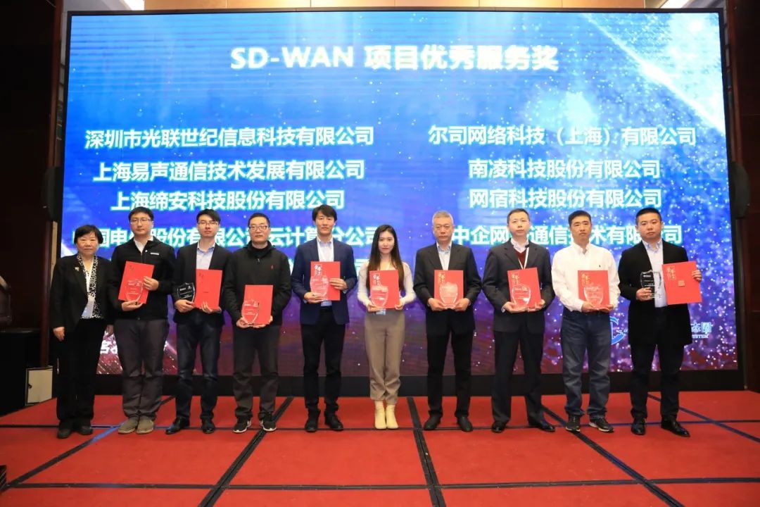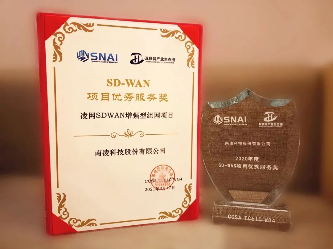 在本次會議召開前,在中國信息通信研究院的指導下,CCSA TC610 WG4發起了“2020年SD-WAN項目優秀評選”,經過為期數月的評審,南凌科技SD-WAN憑借各行業眾多企事業客戶的網絡服務經驗、網絡服務能力、先進的技術及資源覆蓋等競爭優勢,獲得了“2020年度SD-WAN項目優秀服務獎”。